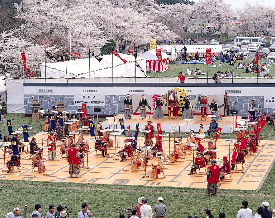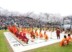 (写真:桜が咲き誇る舞鶴山で行われる人間将棋)