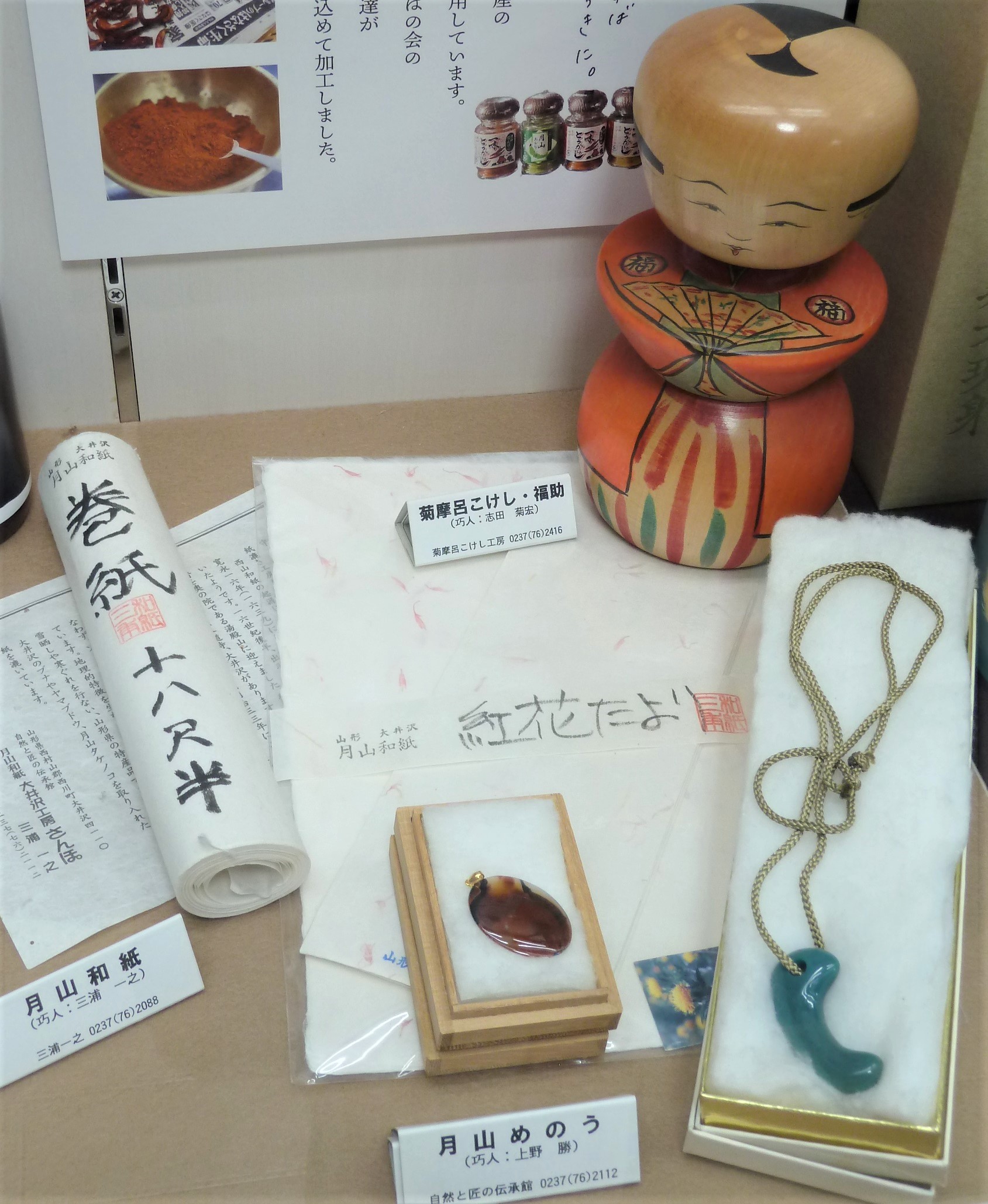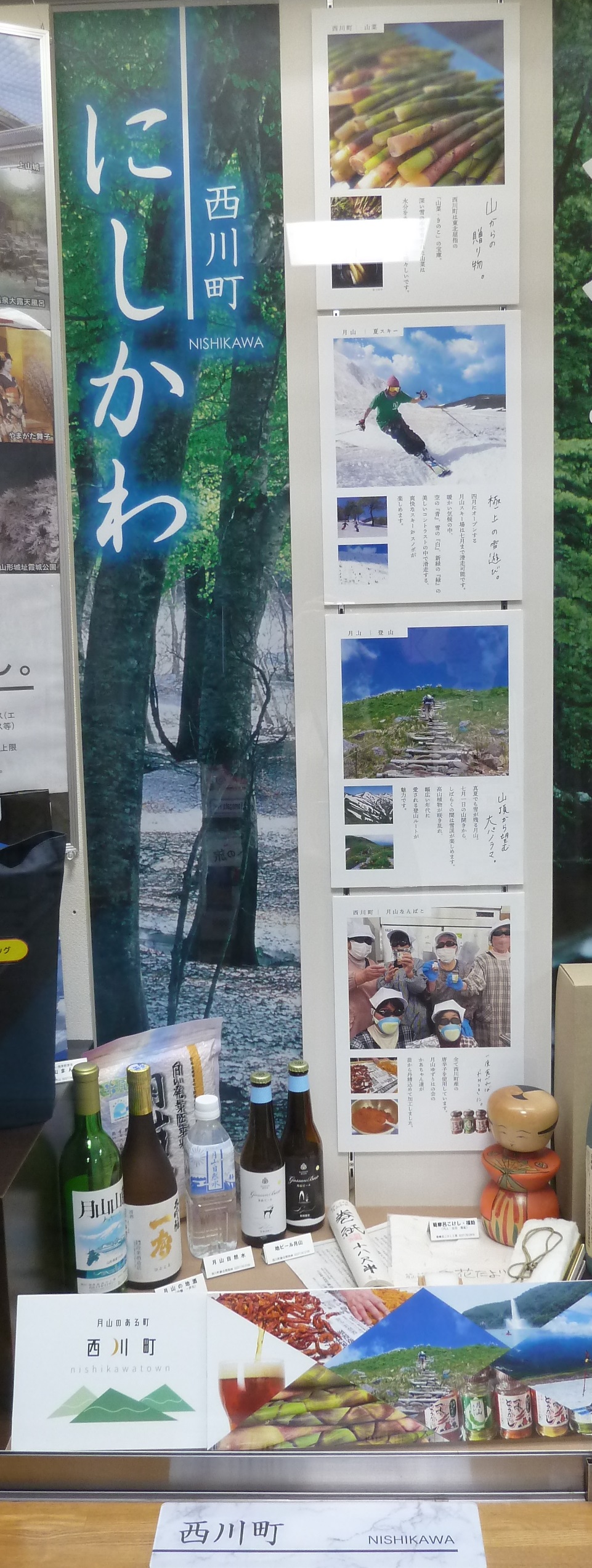 山形ビッグウイング1階エレベーター乗り場前にある、7市7町観光物産展示コーナーの西川町の展示品が新しくなりました。国産の楮(こうぞ)を用いて製法・原料にこだわった手漉き和紙の月山和紙や、月山めのう、個性豊かなこけし。西川町のワイン、地酒、地ビール、月山自然水。月山からの魅力がいっぱい詰まった鮮やかなパネルも展示してあります。是非一度来館してご覧ください。