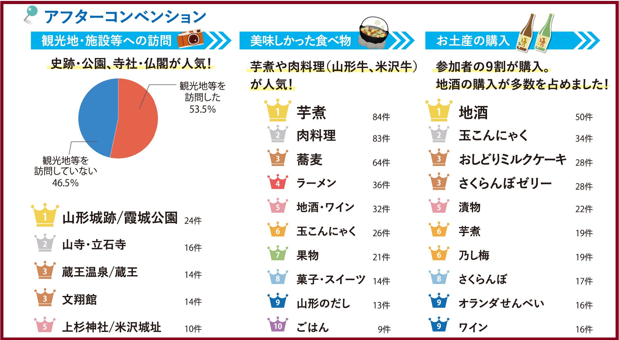 また、現地参加者を対象とした特産品プレゼント事業の応募者を対象としたアンケートを集計した結果、再来訪の意向は「ぜひまた来たい」が約71.1%、「機会があれば来たい」が28.6%と、99%のコンベンション参加者が、また山形に来たいと言ってくださいました。