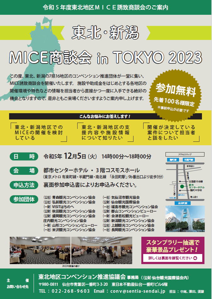 今年12月5日に開催される「東北地区MICE誘致商談会」に出展いたします。東北・新潟の7県16地区のコンベンション推進団体が参加する商談会となっており、東北・新潟地区でコンベンション開催を検討している、又は予定している方は、各地区の担当者から情報を入手できる絶好の機会です。