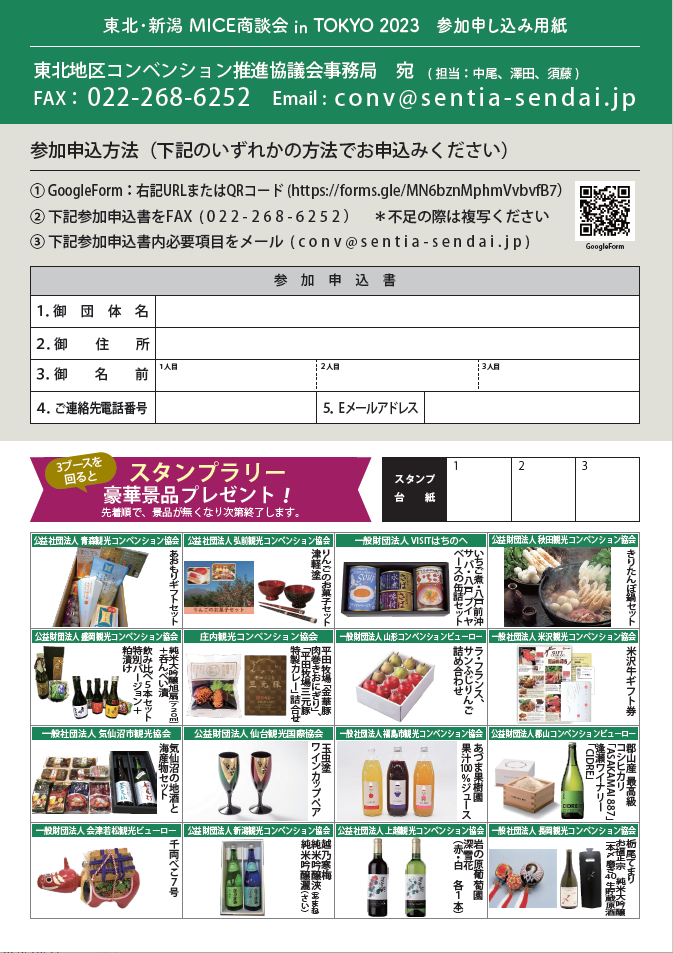 また、今年は3ブースを回ると、各団体で用意しました豪華景品プレゼント(先着順)というスタンプラリーも実施しますので、コンベンション開催を考えている方は是非ご参加ください。
