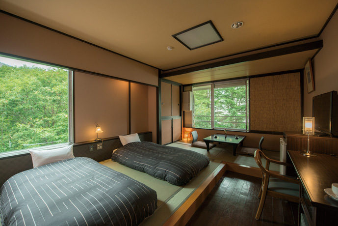 蔵王温泉の中心に位置し、目の前には蔵王中央ロープウェイ、中森ゲレンデまでは徒歩1分。夏はトレッキング、冬はスキーが楽しめます。